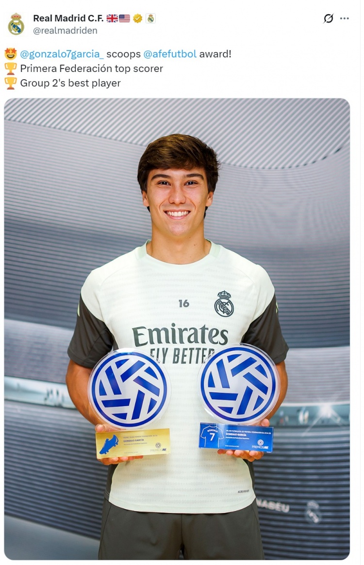 贡萨洛·加西亚是上赛季西协甲最佳射手,并当选上赛季西协甲B组最佳球员,皇马官方社媒晒出贡萨洛·加西亚领奖的照片,对他表示祝贺。